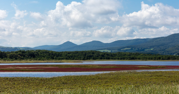 オホーツク海に沿った原生花園で、野鳥の楽園と言われるコムケ湖が近くにあります。紅葉の季節になると、湖岸には真っ赤な絨毯を敷き詰めたかのように広がるサンゴ草群落を鑑賞できます。