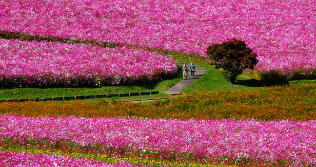 春から秋まで、芝さくら、ツツジ、コスモスを鑑賞できる広大な公園です。中でも「コスモス園」は日本最大級10haの面積があり1,000万本のコスモスが大地を華麗に彩ります。