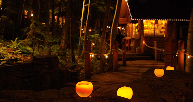 森の中に15棟のログハウスが連なるショッピングエリアのニングルテラス。富良野にしかない自然あふれるクラフト作品の販売をしています。夜にライトアップされた光景も必見です。