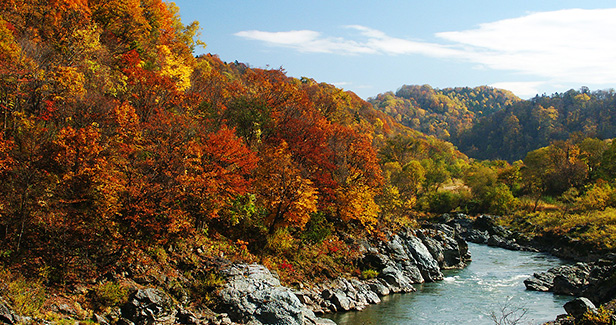 旭川市内有数の景勝地であり、四季折々の景色を川沿いの道路から楽しむことができます。