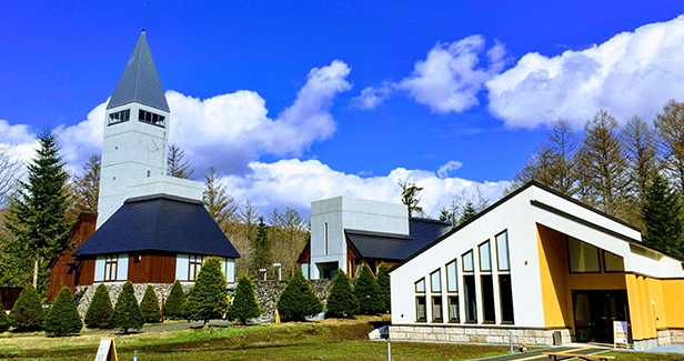 大雪山連峰を目の前に望む素晴らしいロケーション。2万4千坪の丘陵地に広がるぶどう畑の中に店舗とギャラリーが隣接しています。目印になる鐘楼が心地よい音を響かせます。