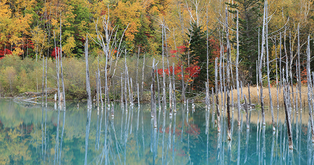 水面全体に輝く神秘的なコバルトブルーが特徴的な池。紅葉の橙・赤・黄の暖色と、青く輝く池のコントラストはとても幻想的です。