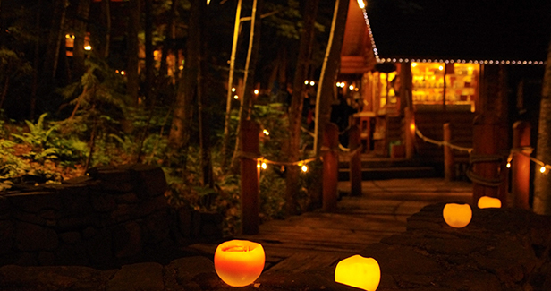 森の中に15棟のログハウスが連なるショッピングエリアのニングルテラス。富良野にしかない自然あふれるクラフト作品の販売をしています。夜にライトアップされた光景も必見です。
