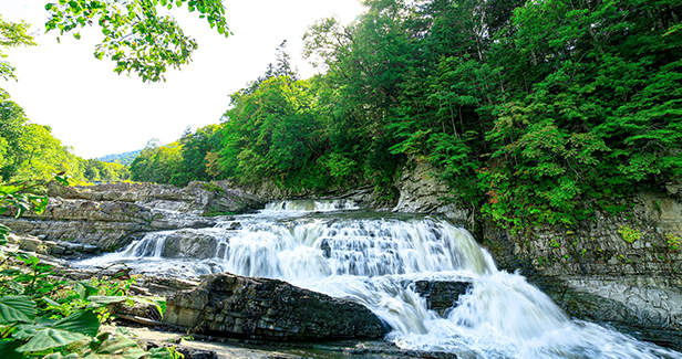 芦別名勝の一つで、遊歩道を渡った先で豪快に流れる滝を水しぶきが飛ぶほど間近で見ることができます。