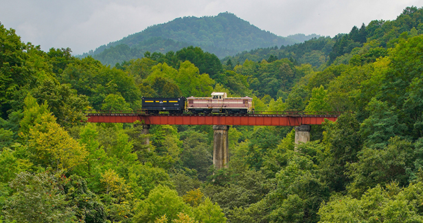 市内を流れる炭山川にかかる橋梁。渓谷に立つ橋脚が連続するさまは圧巻で、芦別を代表する炭鉱遺産です。