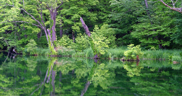 知る人ぞ知る「緑の絶景」がある公園です。エメラルドのように太陽の光を反射してキラキラと輝く美しい沼があります。
