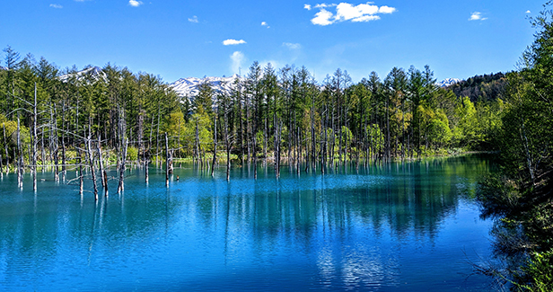 水面全体が輝く神秘的なコバルトブルーが特徴的な池。美しい条件が揃う夏に見るのが特におすすめです。