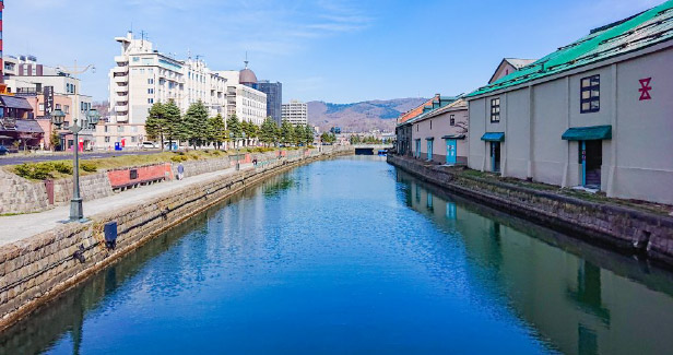大正時代に完成した小樽運河。運河沿いの石造倉庫群は当時の姿のままレストランなどに再利用されています。夕暮れには、ガス灯がともり、石造倉庫群がライトアップされ、昼間とは違った雰囲気を演出しています。