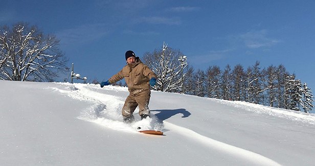 1枚の板から削りだした、手作りのスノーボードの「雪板」。足が固定されないその乗り心地は、まるで雪の上でサーフィンをしているかのようです。スノーボードの経験がなくても大丈夫です。みんなでワイワイ楽しみましょう。