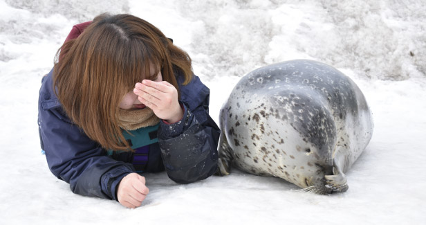 アザラシランドでは餌の時間に、係員の説明を聞きながら間近に観察することができます。アザラシシーパラダイスは元気一杯のアザラシとふれあい体験ができる施設です。