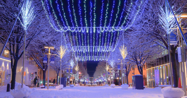 厳冬の凛とした空気の中、雪を被って輝くイルミネーションの煌めきは、凍れる旭川らしい美しい光景です。中心市街地エリアにて約3か月間、アーティスティックなイルミネーションが通りを彩ります。