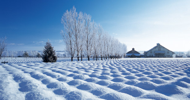 霧氷がついたポプラ並木や樹氷の木々やキラキラと舞い落ちる雪の結晶がつくる白銀の世界。夏とは違う冬ならではのファーム富田ガーデンがご覧いただけます。